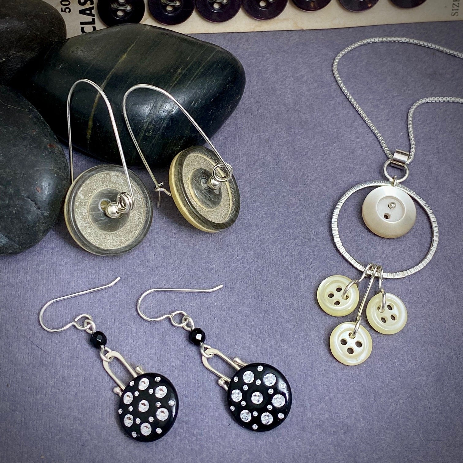 Do you have fond childhood memories of looking through that jar of Grandma's old buttons? Or maybe you've collected buttons, and they are just tucked away somewhere? Lets turn those buttons into something you can wear and enjoy!(You bring in your buttons.) My pic shows several design possibilities to get you started. I have developed some designs to insure buttons stay facing forward - buttons with shanks tend to rotate. You will be making all your own components, ear wires, loops in sterling. No commercial or glue on findings here! Be prepared to make at least 2 pair of earrings or pendants.